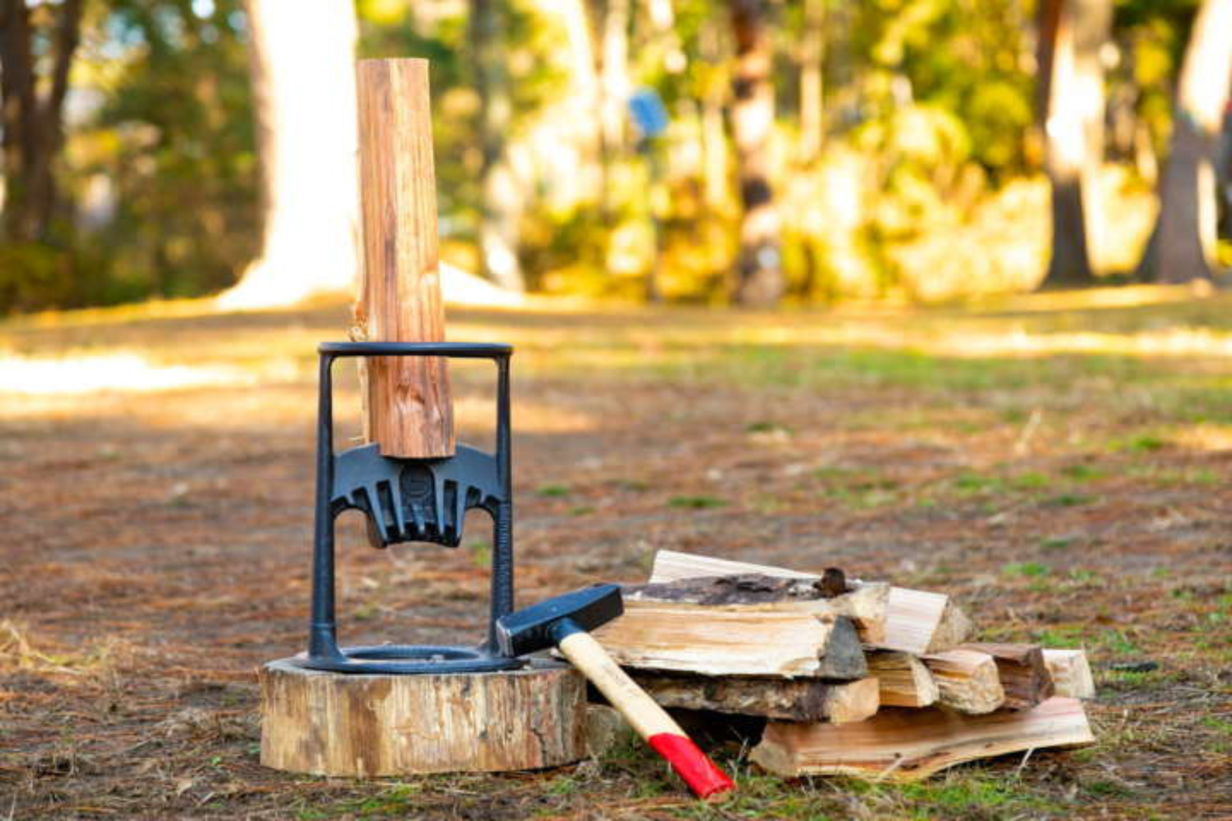 薪を1本ずつ立て、ハンマーで上から軽くたたいて割ってください。
