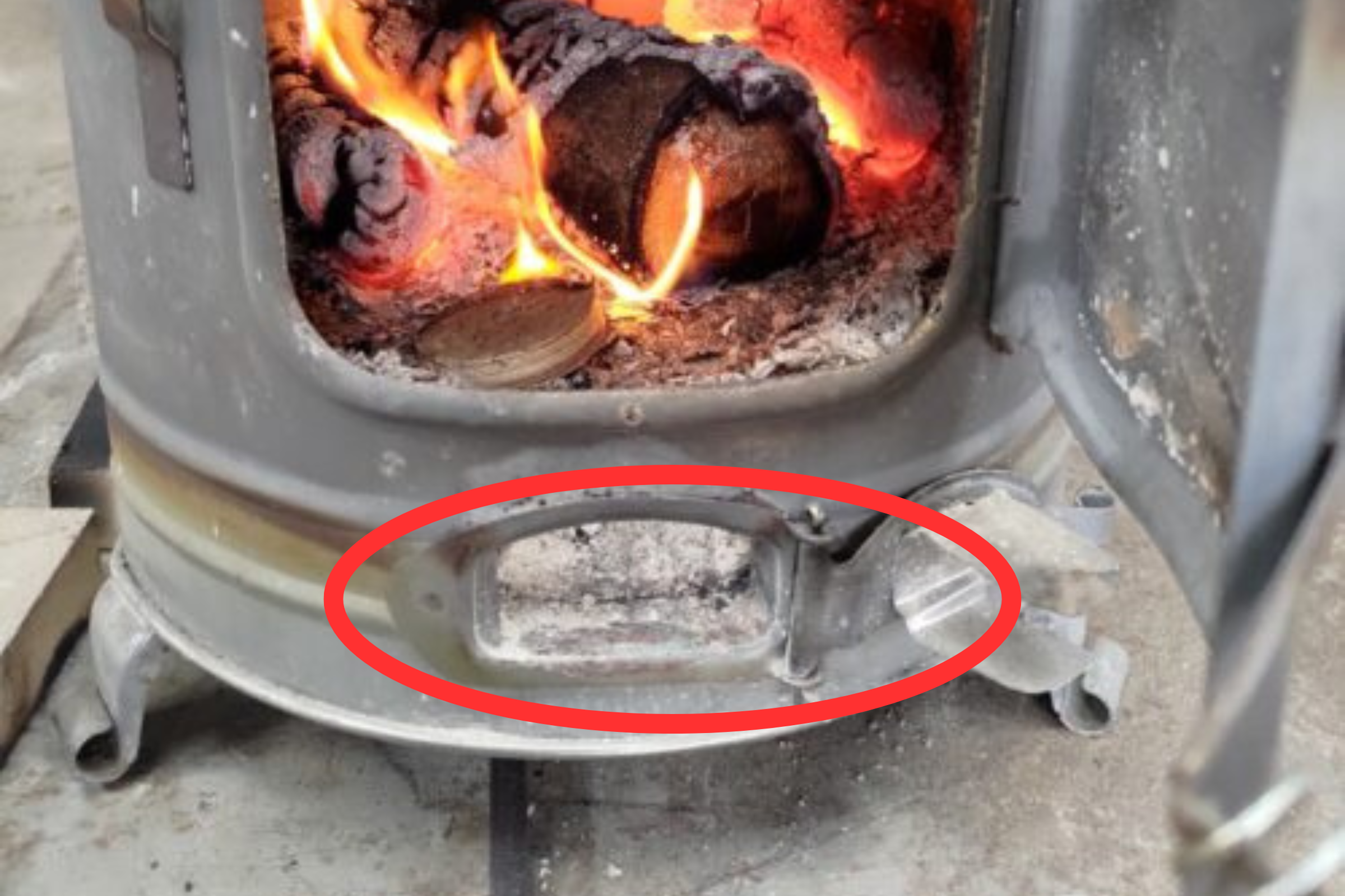 写真の赤丸の空気口を全開にして着火剤に火を点けます。
